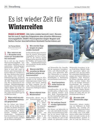 Frage & Antwort. Alle Jahre wieder herrscht vom 1. November bis zum 15. April des Folgejahres eine situative Winterausrüstungspflicht. ÖAMTC-Pressesprecher Jürgen Wagner und Reifen-Fischer-Geschäftsführer Reinhold Fischer klären auf.