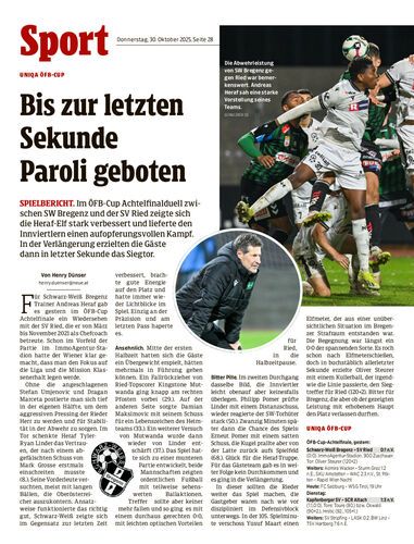 Spielbericht. Im ÖFB-Cup Achtelfinalduell zwischen SW Bregenz und der SV Ried zeigte sich die Heraf-Elf stark verbessert und lieferte den Innviertlern einen aufopferungsvollen Kampf. In der Verlängerung erzielten die Gäste dann in letzter Sekunde das Siegtor.