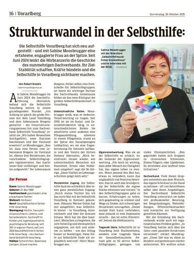 Die Selbsthilfe Vorarlberg hat sich neu aufgestellt – und mit Sabine Moosbrugger eine erfahrene, engagierte Frau an der Spitze. Seit Juni 2024 lenkt die Hörbranzerin die Geschicke des nunmehrigen Dachverbands. Ihr Ziel: Stabilität schaffen, Kräfte bündeln und die Selbsthilfe in Vorarlberg sichtbarer machen.