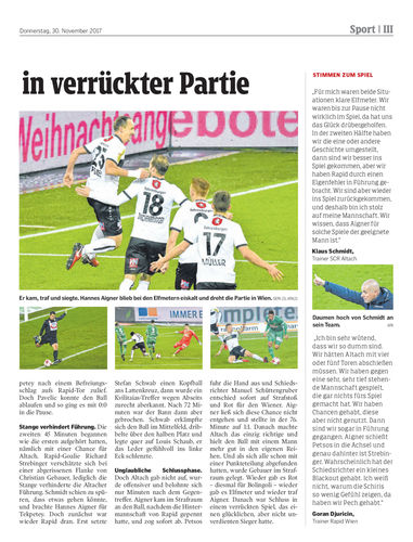 Spielbericht. Dank zwei Elfmeter-Toren von Hannes Aigner in der Schlussphase entführt die Schmidt-Elf nach 0:1-Rückstand drei Punkte aus Hütteldorf und feiert den zweiten Sieg in Folge.