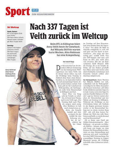 Beim RTL in Killington feiert Anna Veith heute ihr Comeback. Auf Mikaela Shiffrin warten harte Wochen, Alice Robinson hat eine Knieprellung.