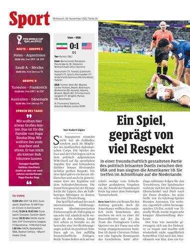 In einer freundschaftlich gestalteten Partie des politisch brisanten Duells zwischen den USA und Iran siegten die Amerikaner 1:0. Sie treffen im Achtelfinale auf die Niederlande.