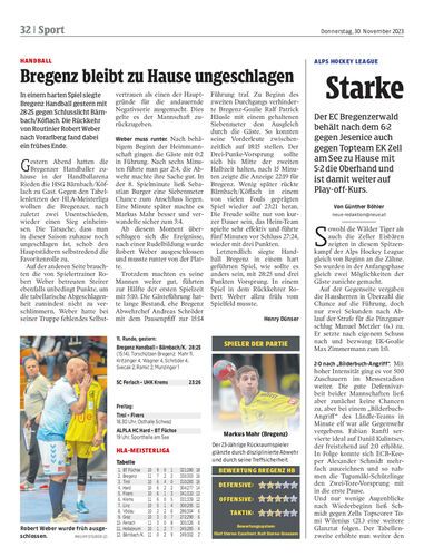 In einem harten Spiel siegte Bregenz Handball gestern mit 28:25 gegen Schlusslicht Bärnbach/Köflach. Die Rückkehr von Routinier Robert Weber nach Vorarlberg fand dabei ein frühes Ende.
