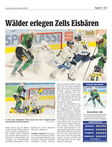 Der EC Bregenzerwald behält nach dem 6:2 gegen Jesenice auch gegen Topteam EK Zell am See zu Hause mit 5:2 die Oberhand und ist damit weiter auf Play-off-Kurs.