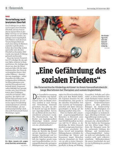 Die Österreichische Kinderliga kritisiert in ihrem Gesundheitsbericht lange Wartelisten bei Therapien und soziale Ungleichheit.