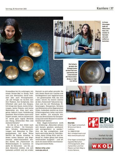 Silke Hagen-Jurkowitsch begleitet Menschen mit Klangschalen, ätherischen Ölen und ihrer Präsenz zurück in ihre innere Balance – dorthin, wo Entspannung, Kraft und Klarheit wieder spürbar werden. Ihr Raum im Milleniumpark in Lustenau ist eine Oase, in der die Zeit scheinbar langsamer läuft.