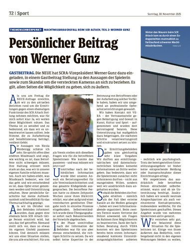 Gastbeitrag. Die NEUE hat SCRA-Vizepräsident Werner Gunz dazu eingeladen, in einem Gastbeitrag Stellung zu den Aussagen der Spielerin sowie zum Skandal um die versteckten Kameras an sich zu beziehen. Es gilt, allen Seiten die Möglichkeit zu geben, sich zu äußern.