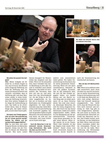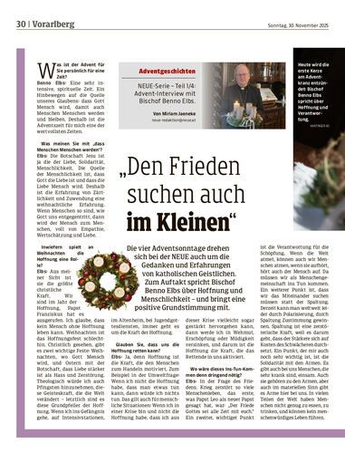 Die vier Adventsonntage drehen sich bei der NEUE auch um die Gedanken und Erfahrungen von katholischen Geistlichen. Zum Auftakt spricht Bischof Benno Elbs über Hoffnung und Menschlichkeit – und bringt eine positive Grundstimmung mit.