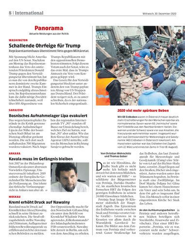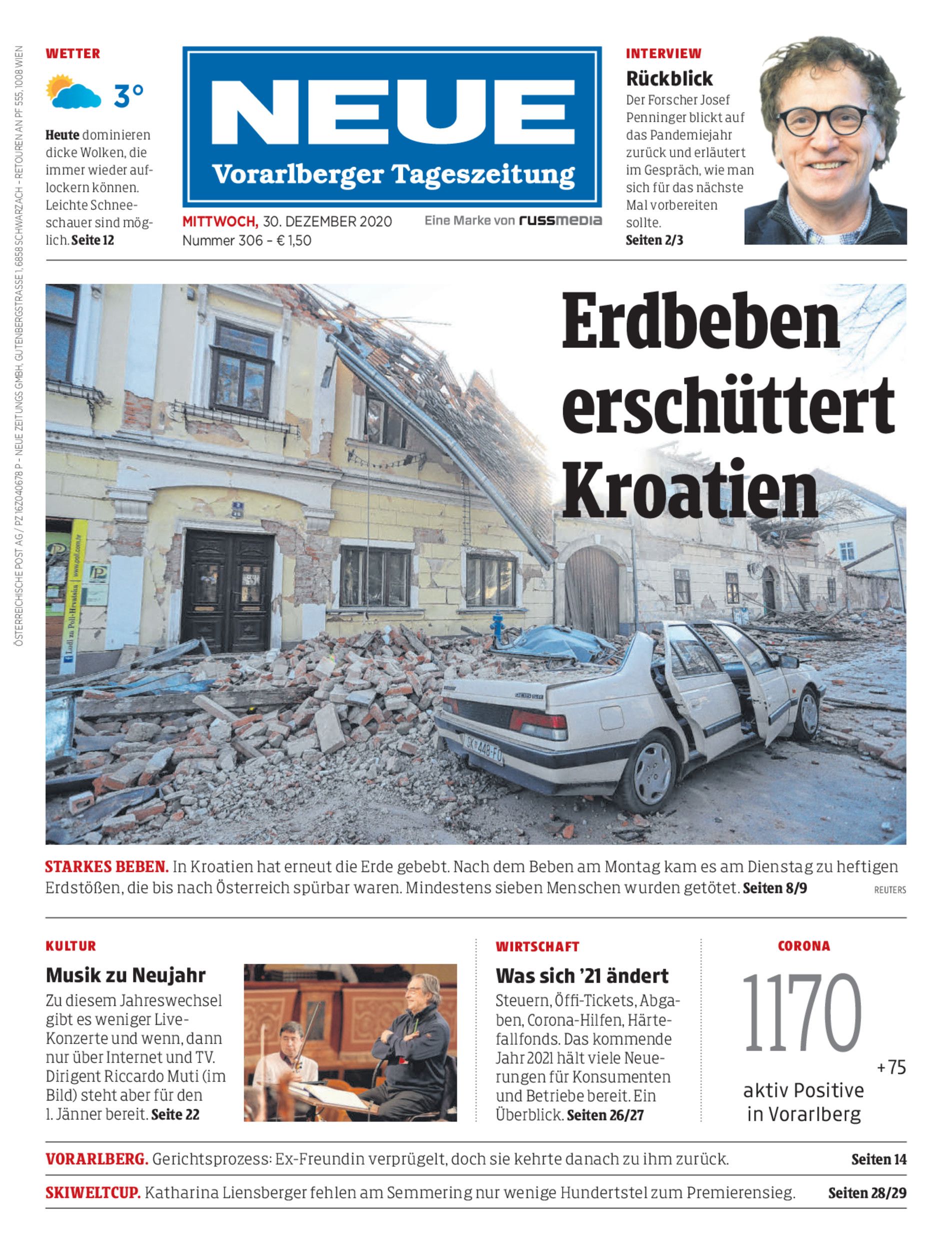 Starkes Beben. In Kroatien hat erneut die Erde gebebt. Nach dem Beben am Montag kam es am Dienstag zu heftigen Erdstößen, die bis nach Österreich spürbar waren. Mindestens sieben Menschen wurden getötet. Seiten 8/9 REUTERS