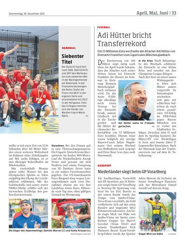 Um 7,5 Millionen Euro wechselte der Altacher Adi Hütter von Eintracht Frankfurt zum Ligarivalen Mönchengladbach.