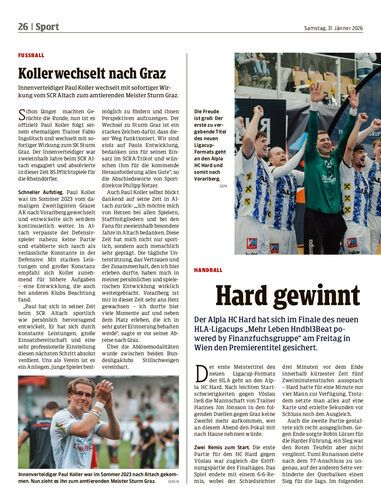 Innenverteidiger Paul Koller wechselt mit sofortiger Wirkung vom SCR Altach zum amtierenden Meister Sturm Graz.