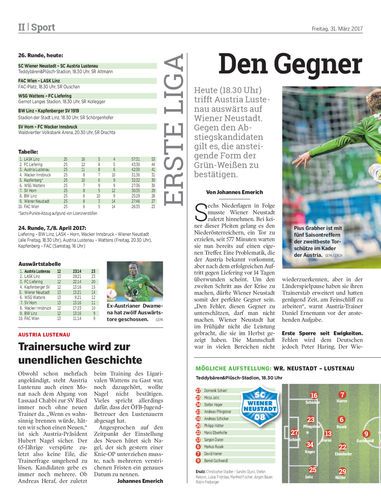 Heute (18.30 Uhr) trifft Austria Lustenau auswärts auf Wiener Neustadt. Gegen den Abstiegskandidaten gilt es, die ansteigende Form der Grün-Weißen zu bestätigen.