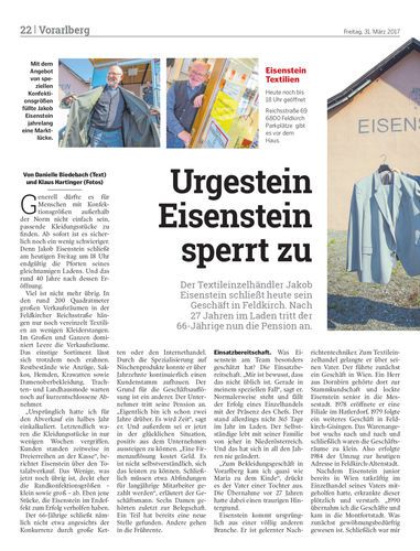 Der Textileinzelhändler Jakob Eisenstein schließt heute sein Geschäft in Feldkirch. Nach
