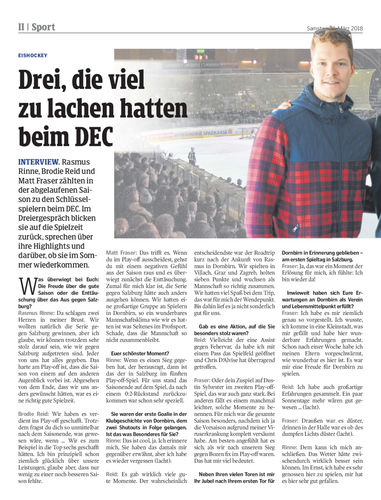 Interview. Rasmus Rinne, Brodie Reid und Matt Fraser zählten in der abgelaufenen Saison zu den Schlüsselspielern beim DEC. Im Dreiergespräch blicken sie auf die Spielzeit zurück, sprechen über ihre Highlights und darüber, ob sie im Sommer wiederkommen.