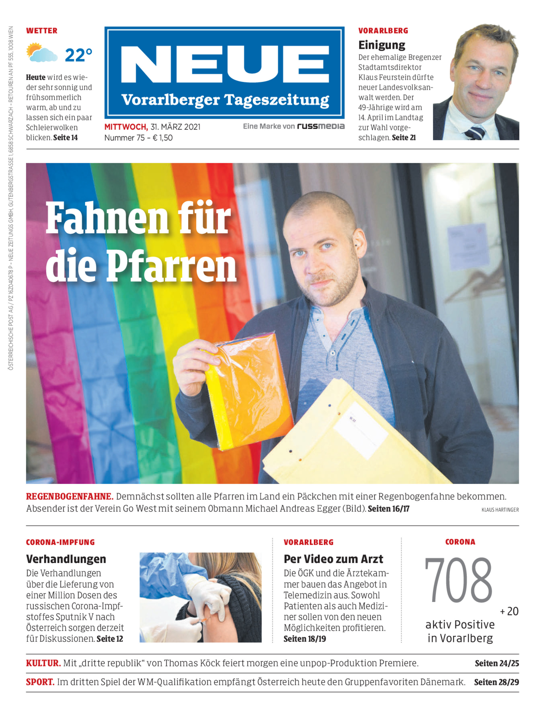 Regenbogenfahne. Demnächst sollten alle Pfarren im Land ein Päckchen mit einer Regenbogenfahne bekommen. Absender ist der Verein Go West mit seinem Obmann Michael Andreas Egger (Bild). Seiten 16/17 Klaus Hartinger