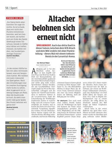 Spielbericht. Auch das dritte Duell in dieser Saison zwischen dem SCR Altach und dem WAC endete mit einer Punkteteilung – dieses Mal mit einem torlosen-Remis in der Lavanttal-Arena.