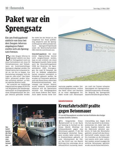 Ein am Freitagabend südlich von Graz bei den Zeugen Jehovas abgelegtes Paket stellte sich als Sprengsatz heraus.