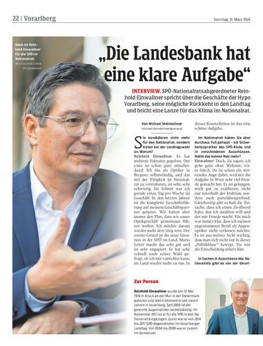 Interview. SPÖ-Nationalratsabgeordneter Reinhold Einwallner spricht über die Geschäfte der Hypo Vorarlberg, seine mögliche Rückkehr in den Landtag und bricht eine Lanze für das Klima im Nationalrat.