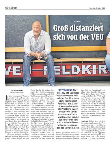 Hintergrund. Nach der Play-off-Euphorie bei den Pioneers kehrt wieder der Alltag am Eishockestandort Feldkirch ein. Damit rücken zwei ungelöste Probleme in den Fokus: Wer in der kommenden Saison Hauptsponsor bei den Pioneers Vorarlberg wird sowie die Steueruntersuchungen gegen die VEU Feldkirch.