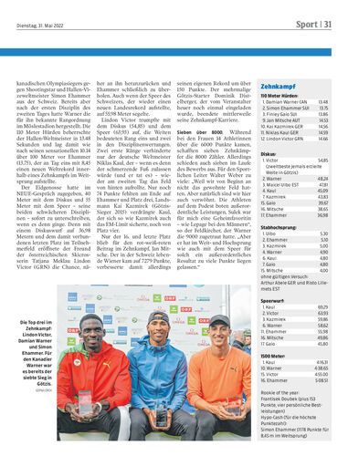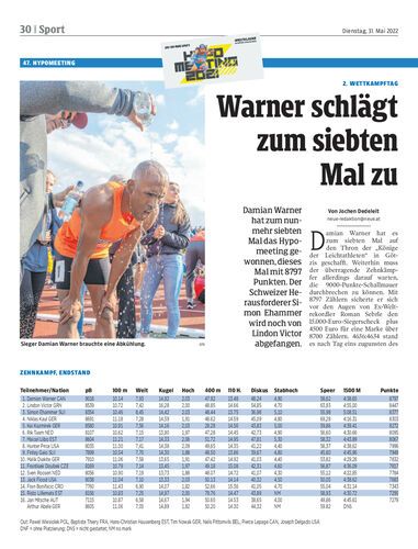 Damian Warner hat zum nunmehr siebten Mal das Hypomeeting gewonnen, dieses Mal mit 8797 Punkten. Der Schweizer Herausforderer Simon Ehammer wird noch von Lindon Victor abgefangen.