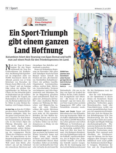 Kolumbien feiert den Toursieg von Egan Bernal und hofft nun auf einen Push für den Friedensprozess im Land.