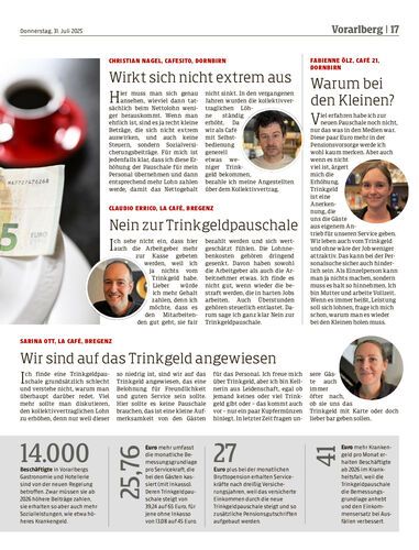 Ab 2026 wird die neue Trinkgeldpauschale auch in Vorarlberg Pflicht. Die NEUE hat sich in der heimischen Gastronomie umgehört. Die Meinungen gehen von pragmatischer Zustimmung bis zu klarer Ablehnung.