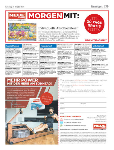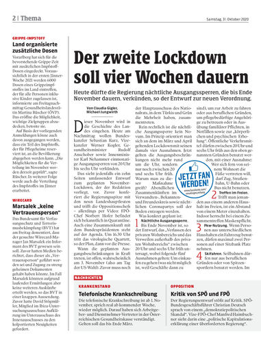 Zweiter Lockdown. Im Kampf gegen Corona ist auch eine nächtliche Ausgangssperre geplant. Heute um 16.30 Uhr wird die Regierung strikte Maßnahmen verkünden. Der zweite Lockdown soll vier Wochen dauern. Seiten 2/3 Hartinger