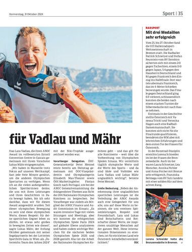 Das österreichische Olympia-Gold-Duo Vadlau/Mähr wurde am Mittwoch bei den ANOC Awards im portugiesischen Cascais als „Best Mixed Team in Individual Sports of Paris 2024“ für ihre herausragenden Leistungen bei der olympischen Regatta geehrt.