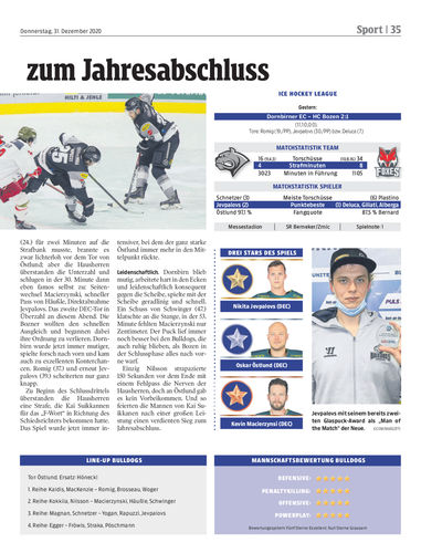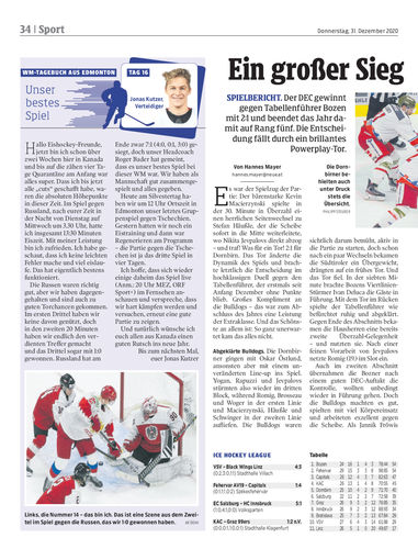 Spielbericht. Der DEC gewinnt gegen Tabellenführer Bozen mit 2:1 und beendet das Jahr damit auf Rang fünf. Die Entscheidung fällt durch ein brillantes Powerplay-Tor.