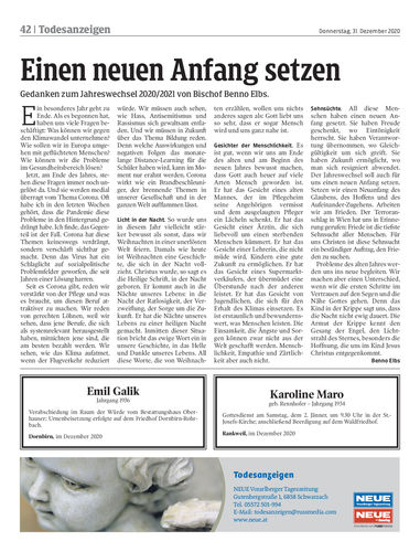 Gedanken zum Jahreswechsel 2020/2021 von Bischof Benno Elbs.