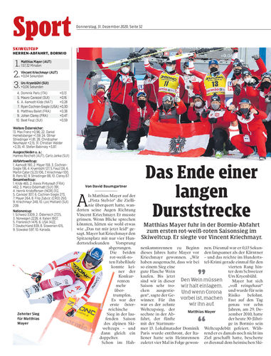 Matthias Mayer fuhr in der Bormio-Abfahrt zum ersten rot-weiß-roten Saisonsieg im Skiweltcup. Er siegte vor Vincent Kriechmayr.
