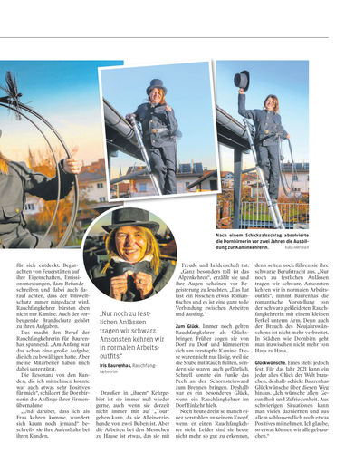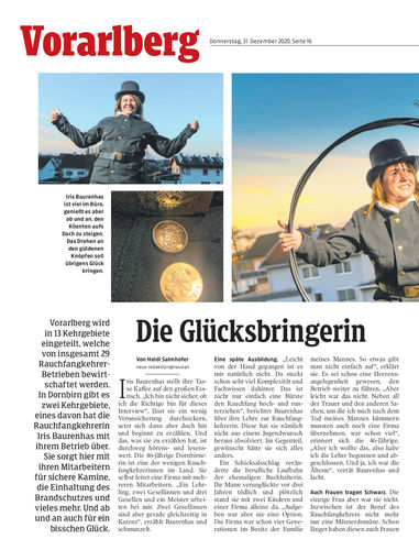 Vorarlberg wird in 13 Kehrgebiete eingeteilt, welche von insgesamt 29 Rauchfangkehrer-Betrieben bewirtschaftet werden. In Dornbirn gibt es zwei Kehrgebiete, eines davon hat die Rauchfangkehrerin Iris Baurenhas mit ihrem Betrieb über. Sie sorgt hier mit ihren Mitarbeitern für sichere Kamine, die Einhaltung des Brandschutzes und vieles mehr. Und ab und an auch für ein bisschen Glück.