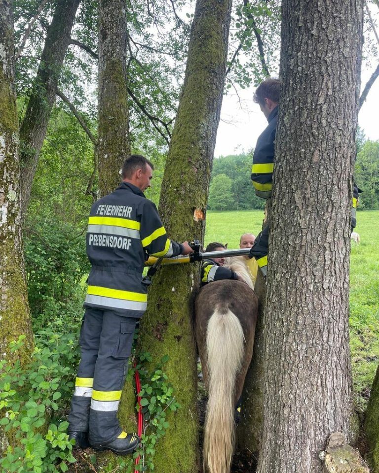 Die Feuerwehr Prebensdorf befreite am Mittwoch ein junges Pferd, das zwischen zwei Bäumen feststeckte. Laut Kommandant Marco Fank wurde es vermutlich von anderen Pferden gejagt.