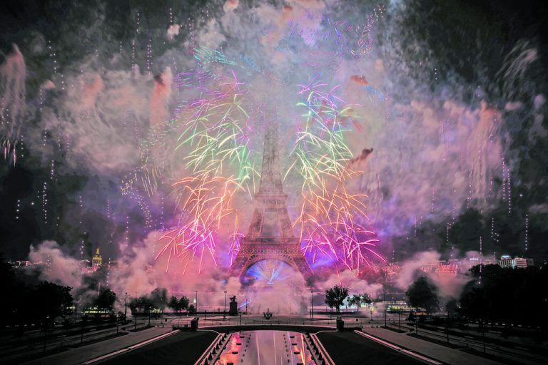 Ein spektakuläres Feuerwerk und eine Drohnenshow erleuchten den Eiffelturm in der Nacht des französischen Nationalfeiertags. Frankreich würdigte heuer auch den historischen Kriegseintritt der USA vor 100 Jahren. US-Präsident Donald Trump war Ehrengast bei der Militärparade auf den Champs-Élysée