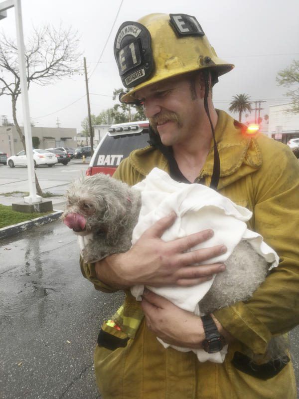 Mit Mund-zu-Schnauze-Beatmung hat Feuerwehrmann Andrew Klein nach einem Wohnungsbrand in Santa Monica einen Hund gerettet. Der Mischling hatte nicht mehr geatmet und keinen Puls. Die Besitzerin war über das beherzte Eingreifen von Klein überglücklich.