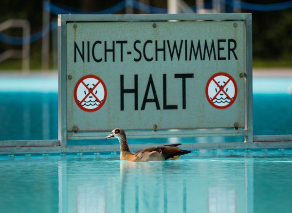 Nicht sehr gut besucht war das Brentanobad in Frankfurt am Main am Freitag. Das war die Gelegenheit für eine Nilsgans, ihre Runden im Nichtschwimmerbecken zu drehen. Die Begeisterung der Bademeister über den Besuch des Vogels hielt sich in Grenzen. Während der Badesaison hatten sie öft