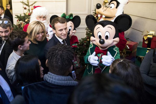 Der französische Präsident Emmanuel Macron (Mitte) und seine Ehefrau Brigitte besuchten am Mittwoch die traditionelle Weihnachtsfeier für Kinder im Élysée Palast in Paris. Da Disneyland auch einen Standort in Frankreich hat, wurde der hohe Besuch von Micky Maus und seiner First Lady Mi