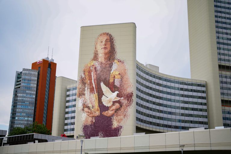 In der Wiener UNO-City wurde am Freitag die größte Wandmalerei der Bundeshauptstadt eingeweiht. Das Gemälde der australischen Künstlerin Fintan Magee zeigt eine Frau mit Friedenstaube.