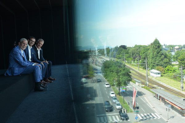 Bundespräsident Alexander Van der Bellen nutzte die Gelegenheit bei der Besichtigung der Angelika-Kauffmann-Schau im vorarlberg museum, und genoss die Aussicht aus dem Panoramaraum. Mit dabei waren auch Markus Wallner und Markus Linhart.