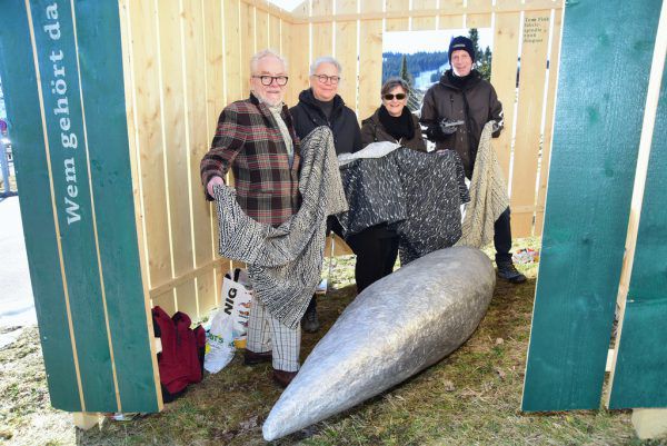 Der Künstler Tone Fink (l.) hat vor wenigen Tagen sein Kunstwerk in jener Hütte installiert, die im Rahmen der Schau „Wem gehört das Bödele?“ ebendort aufgestellt wurde. Im Bild zu sehen sind die große Spule, die an die Textilindustrie erinnern soll, sowie Textil-Muster von Fink.