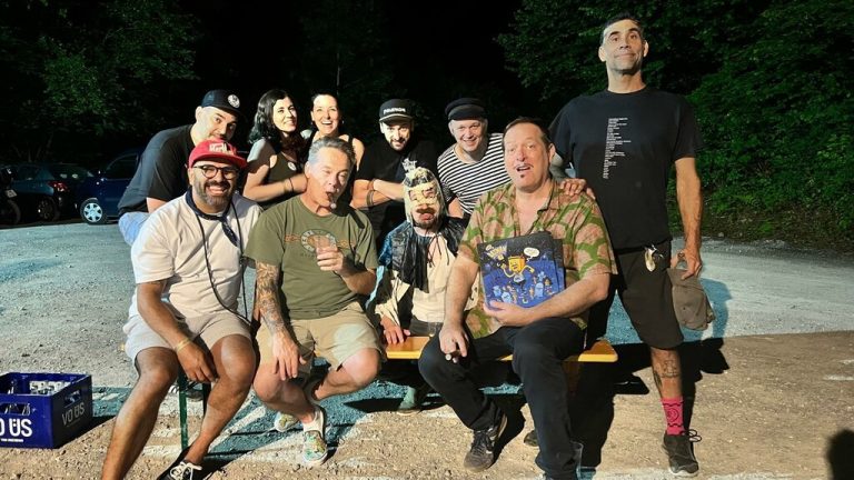UH!-Batman and the Mighty Antiheroes und Mitglieder der Punk-Rock-Supergroup-Coverband Me First and the Gemme Gimmes vergangenen Freitag im Conrad Sohm. Links neben dem maskierten Batman, The-Damned-Schlagzeuger Andrew Pinching am Zigarre rauchen, rechts posiert Rocket-from-the-Crypt-Frontman J