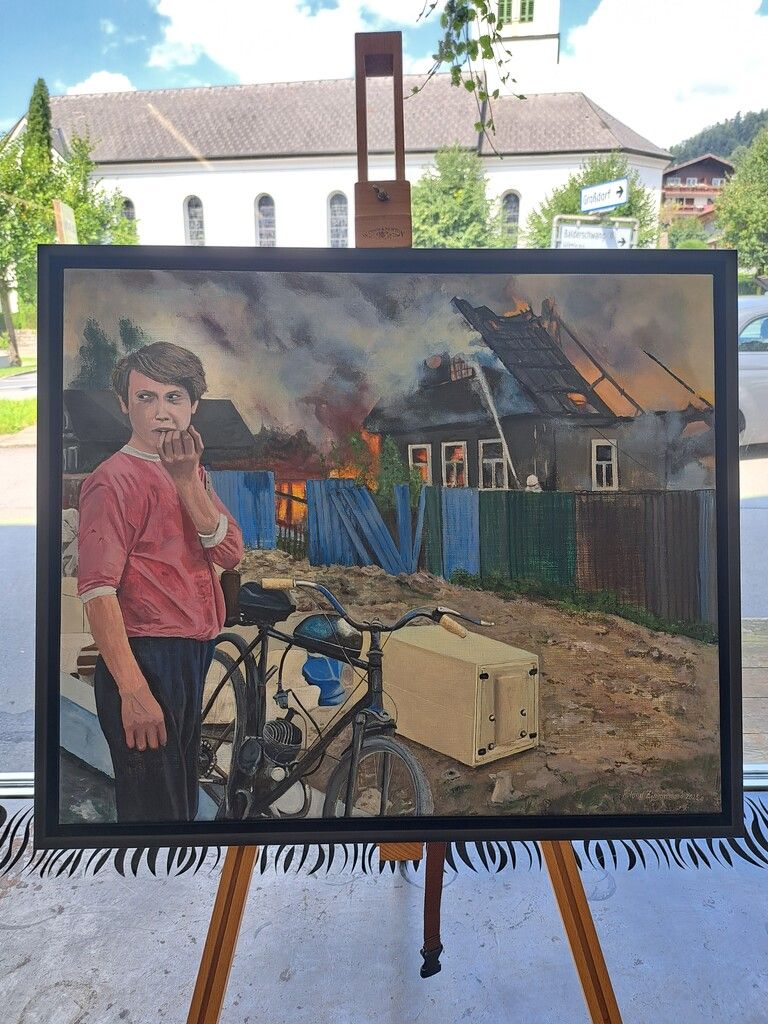 Roman Zimmermann ist mit seinem Gemälde „Feuer“ einer von 23 Bregenzerwälder Künstlern, deren Arbeiten heute und morgen in der ehemaligen Gärtnerei Blumig, Lingenau, ausgestellt sind. Die Schau ist Teil des Wettbewerbs „Kunstbräu Vorlauf“, die sich der Sichtbarmachung Bregenzerwälder Kunst vers