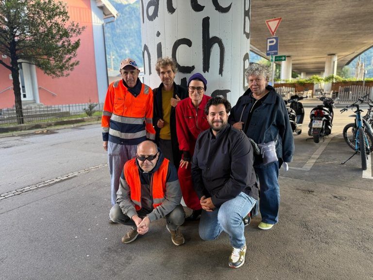 „Betonsonne“, das neue Werk der Künstlerin Christine Lederer, wurde vergangenen Freitag in Bludenz eröffnet. Auf diesem Bild posieren Reinhold Capelli (l.), Thomas Heel, Lorenz Helfer, Lederer, Stadtrat Cenk Dogan und Judith Batlogg vor einem der zwei Arbeiten, das den Schriftzug „ich halte mic