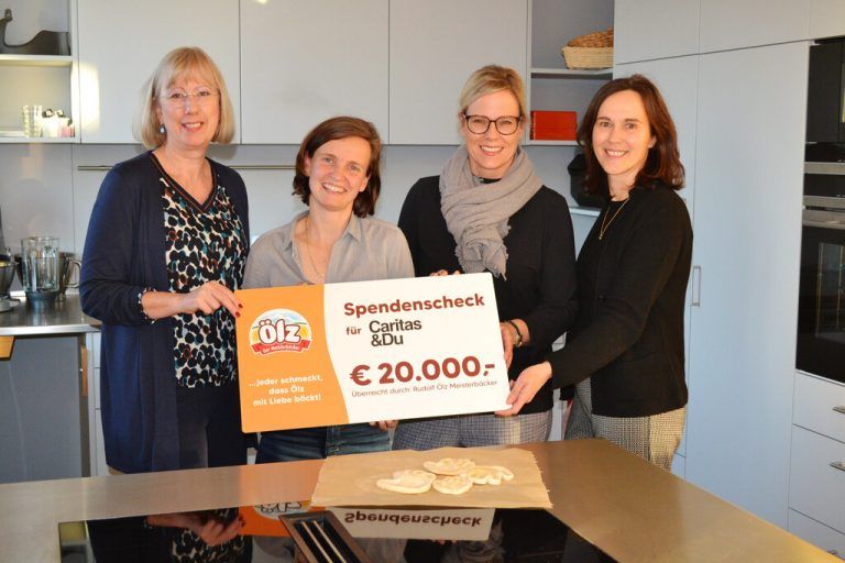 Die Firma Ölz der Meisterbäcker hat unlängst dem Familienhaus St. Michael der Caritas einen Spendenscheck in Höhe von 20.000 Euro überreicht. Doris Wendel und Carolin Dobler haben ihn an Doris Müller übergeben.