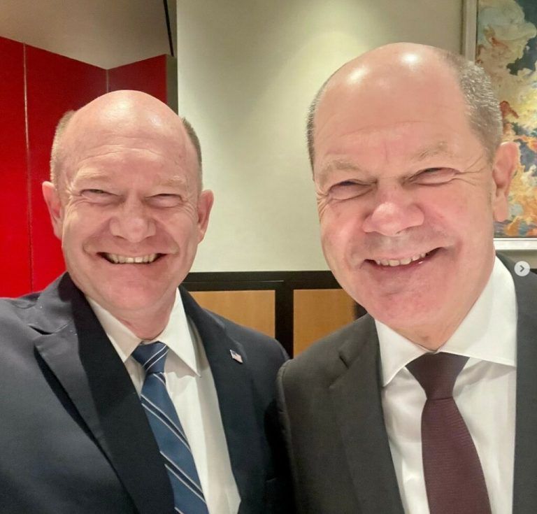 Auf den ersten Blick sehen sie sich zum Verwechseln ähnlich: Der deutsche Bundeskanzler Olaf Scholz hat bei seinem Besuch in der US-Hauptstadt Washington seinen amerikanischen Doppelgänger Chris Coons getroffen. Der 60-Jährige ist Senator aus dem Bundesstaat Delaware und Mitglied der Demokraten