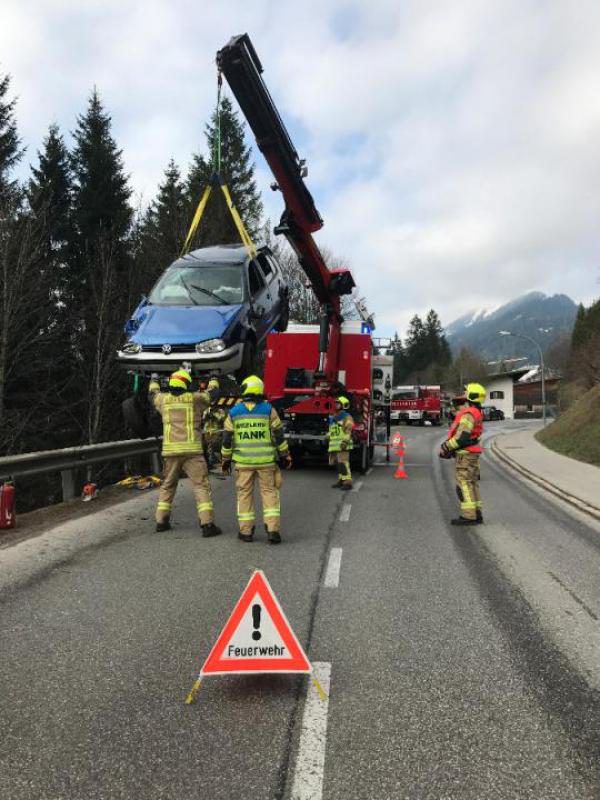 Leicht verletzt wurde eine Pkw-Lenkerin am Sonntagfrüh im Kleinwalsertal. Die 23-Jährige fuhr gegen 5 Uhr auf der L 201 nach Riezlern. In einer Linkskurve geriet sie von der Fahrbahn ab und stürzte etwa 30 Meter über eine steil abfallende Böschung. Dabei wurde der Pkw total beschädigt. Der