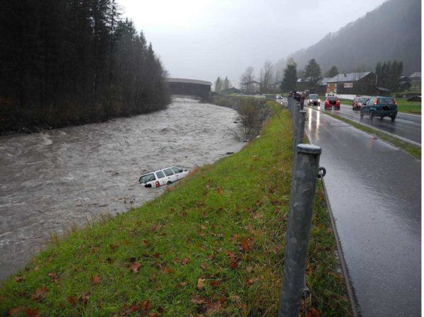 Unverletzt überstanden hat ein 21-jähriger Autofahrer am Freitag einen aufsehenerregenden Unfall in Mellau. Der junge Mann stürzte mit seinem Pkw in die Bregenzerach. Zuvor war er auf der regennassen L 200 mit dem Auto einer 76-Jährigen kollidiert, als dieses auf die Landesstraße einbog. Der 21-Jähr