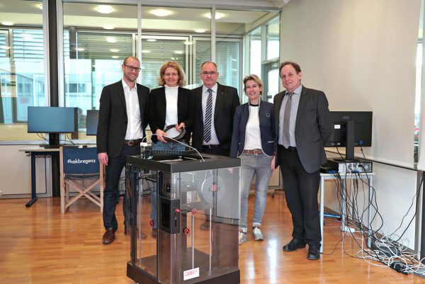 Mit neuester IT-Hardware, darunter ein 3D-Drucker, unterstützen die Verantwortlichen der WKV-Fachgruppe UBIT die HAK Bregenz. Im Bild: Lehrpersonen Alexander Berzler und Verena Fastenbauer, Christian Bickel, Sibylle Drexel (UBIT), HAK Bregenz-Direktor Manfred Hämmerle (v.l.). WKV