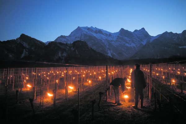 Schweizer Reben in den Weinbergen nahe der Grenze zum Fürstentum Liechtenstein werden dieser Tage mit Frostkerzen und Brikettfeuer vor der Kälte geschützt. Immer dann, wenn die Temperatur unter null Grad Celsius sinkt. Seit zwei Jahren arbeiten Winzer im ganzen Land damit. Frostnächte