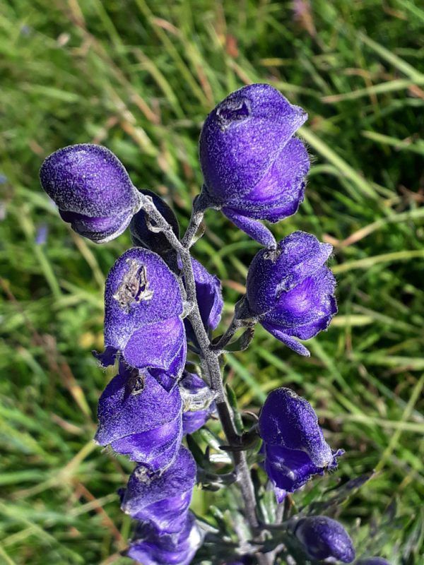 Blauer Eisenhut oder Sturmhut (Aconitum napellus): „Aconitum“ (akoniton) ist der lat.-griech. Name für eine Giftpflanze, die in der Mythologie mit dem Berg Akonitos assoziiert wurde; „napellus“ ist die Verkleinerungsform von lat. Napus = Rübe, bezogen auf das knollige Rhizom. „Eisenhut“ wegen der Ge